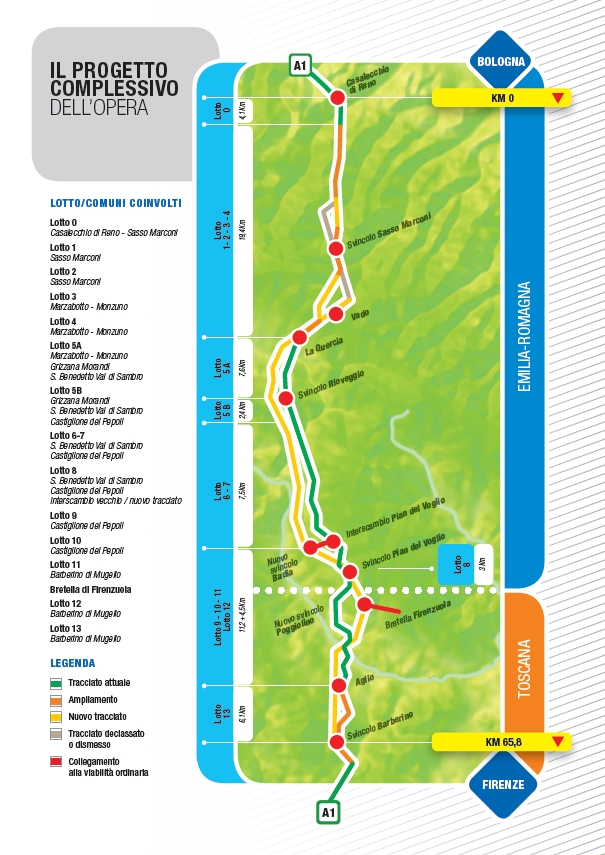 La Variante di Valico, inserita nell’ambito del progetto di potenziamento della A1 Milano-Napoli, è un’opera di importanza strategica per il collegamento tra Nord e Sud del Paese. Si estende per 59 chilometri tra Sasso Marconi e Barberino del Mugello attraversando il territorio di otto Comuni, sei dell’Emilia-Romagna e due della Toscana. Al progetto va ad aggiungersi il lavoro di ampliamento e allacciamento nel tratto che va da Casalecchio a Sasso Marconi, che è stato appunto denominato Lotto 0 della Variante di Valico.