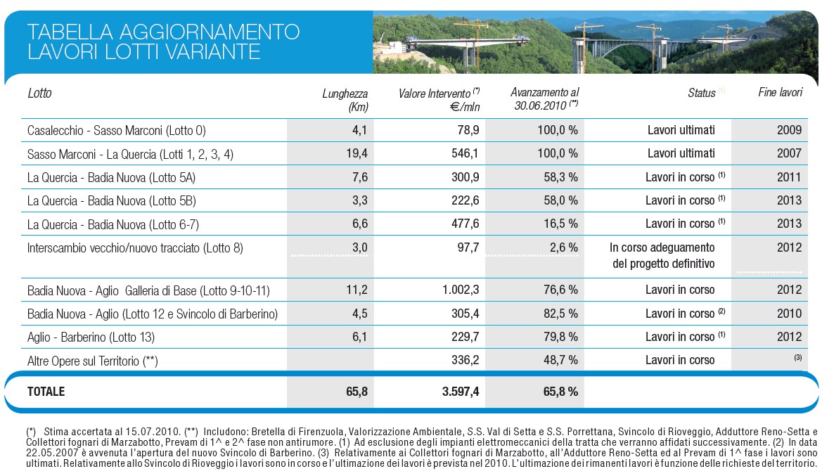 I primi 20 chilometri dell’opera, tra Sasso Marconi e La Quercia, sono stati progressivamente aperti al traffico entro agosto 2006. A maggio 2007 è stato aperto al traffico il nuovo svincolo/stazione di Barberino di Mugello.