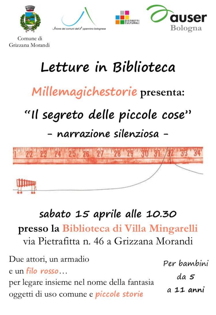 Sabato 15 aprile ore 10,30 presso la Biblioteca Comunale a Villa Mingarelli, Via Pietrafitta 46 Grizzana Morandi. Narrazione silenziosa per bambini da 5 a 11 anni a cura di Millemagichestorie. Due attori, un armadio e un filo rosso…per legare insieme nel nome della fantasia oggetti di uso comune e piccole storie. Ingresso gratuito.