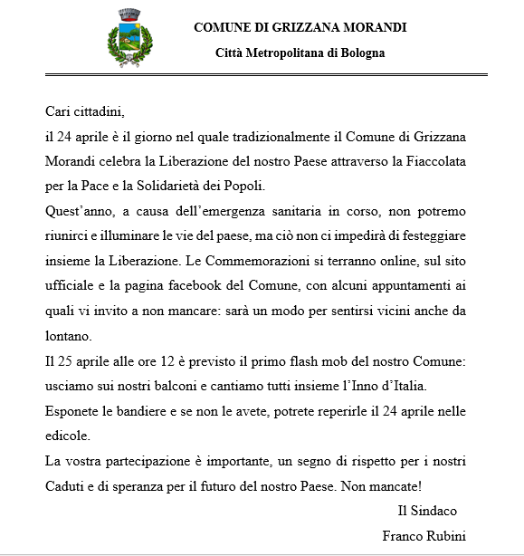 Invito ai cittadini a partecipare al Flash Mob del 25 aprile ore 12. L'Inno d'Italia dai balconi con le bandiere tricolore.
