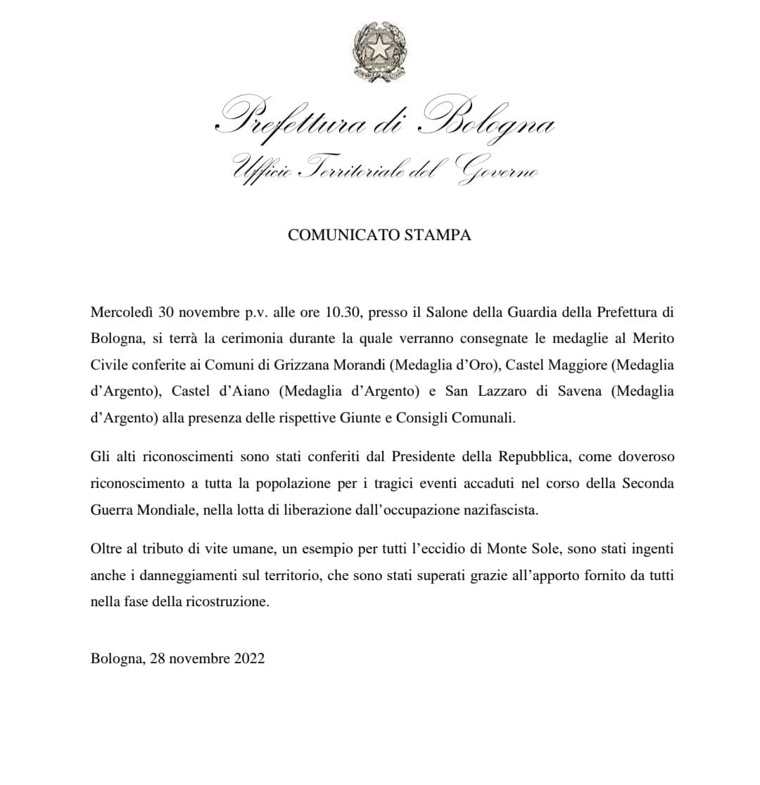 Il Comune di Grizzana Morandi riceve la Medaglia d'oro al Merito Civile per il "grandissimo esempio di lotta partigiana, di coraggio, di spirito di sacrificio e di virtù civiche". A breve sarà convocata una seduta straordinaria del Consiglio Comunale nella quale l'assegnazione della Medaglia d'oro verrà ufficializzata e condivisa con la Cittadinanza.