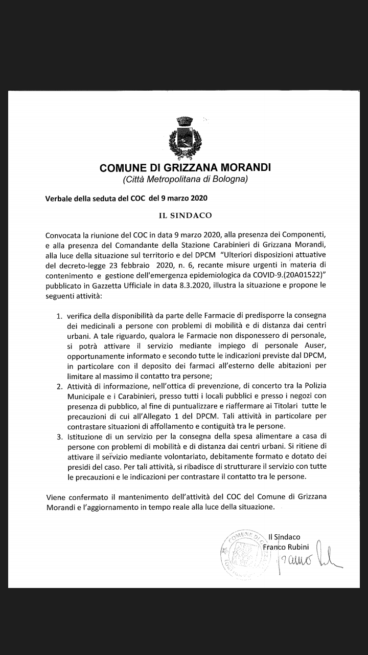 Leggi il verbale della seduta del COC del Comune di Grizzana Morandi del 9 marzo 2020