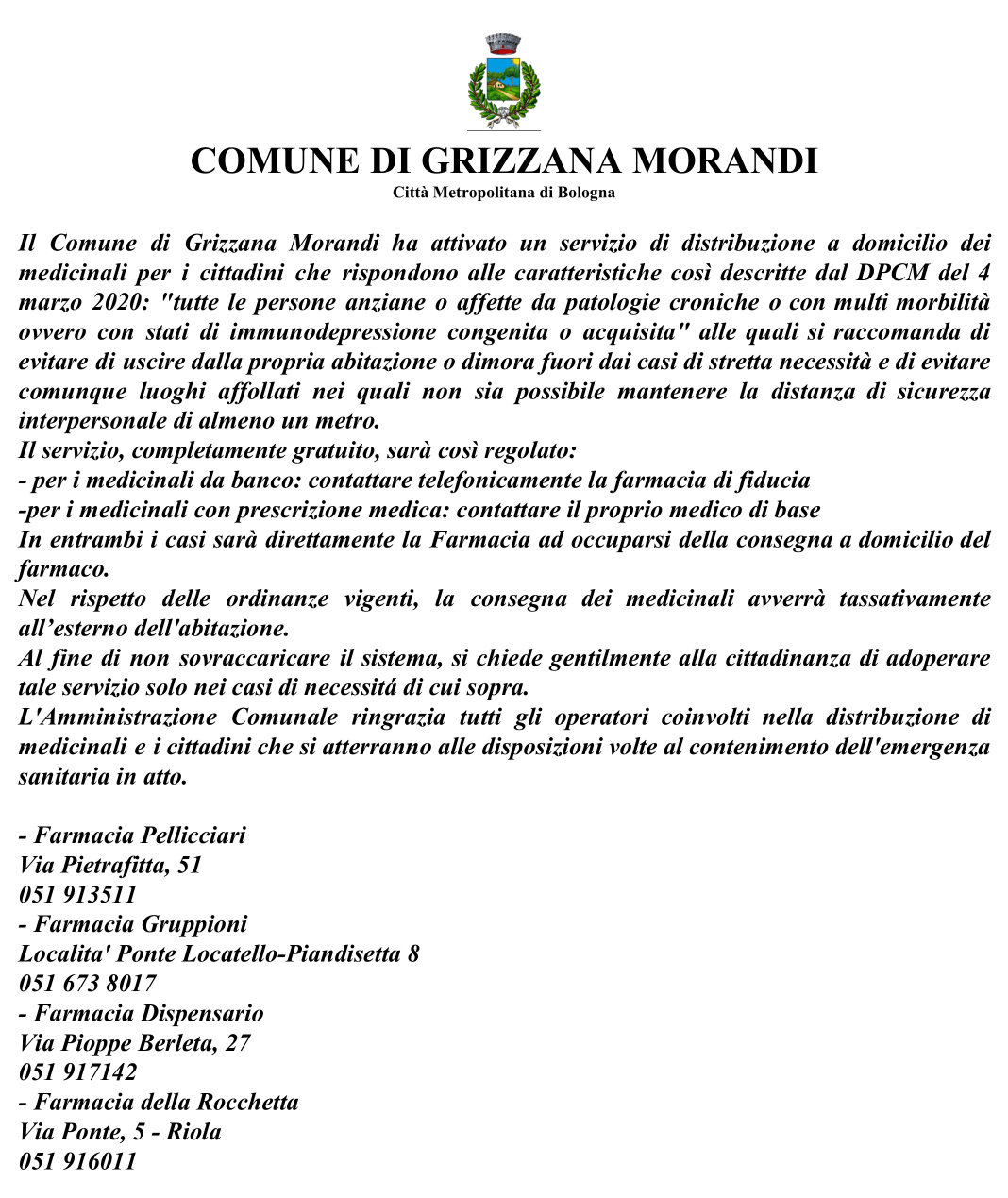 Comunicato relativo al servizio di distribuzione emergenziale di farmaci attivato dal Comune di Grizzana Morandi