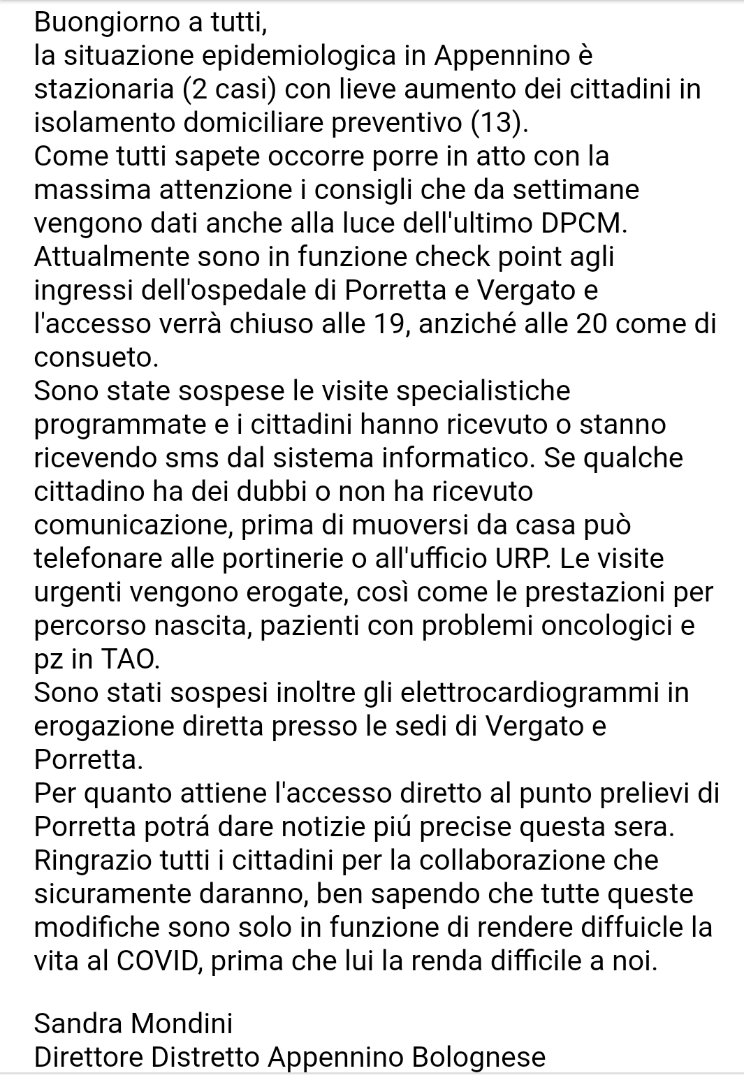 Coronavirus. Comunicato Distretto AUSL Porretta Terme