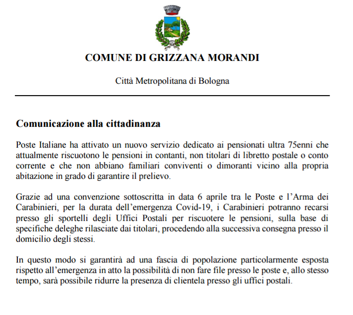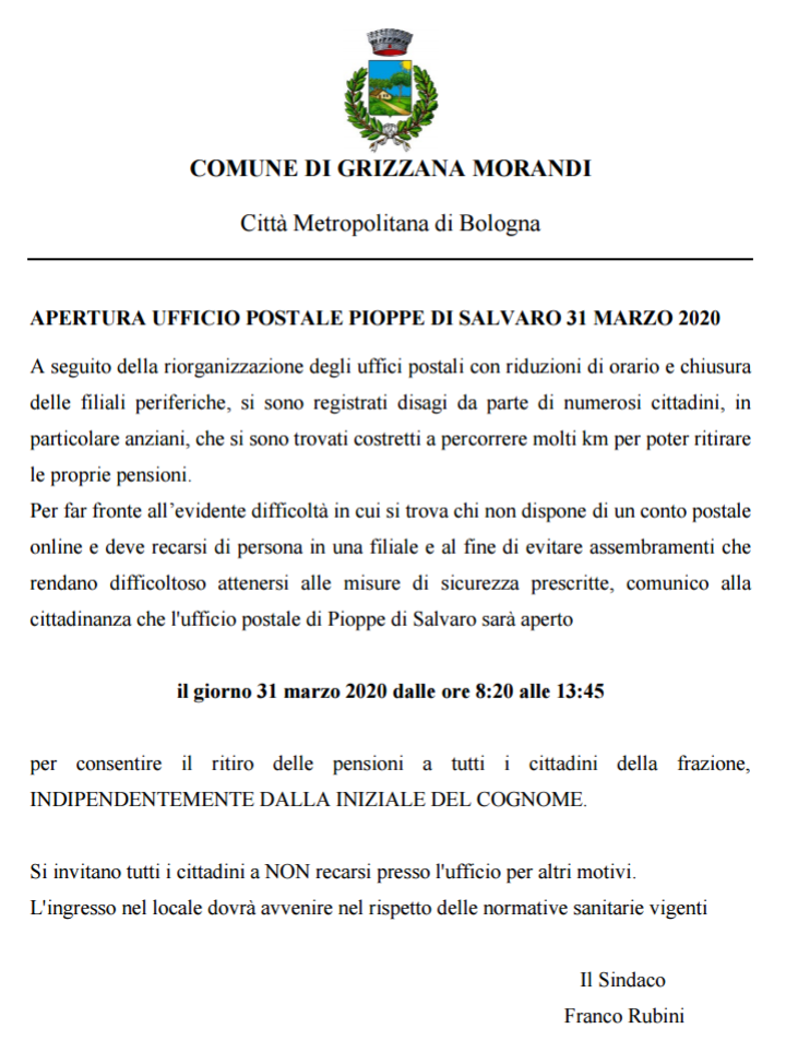 Si comunica che l'ufficio postale di Pioppe di Salvaro sarà aperto il giorno 31 marzo 2020 dalle ore 8:20 alle 13:45 per consentire il ritiro delle pensioni a tutti i cittadini della frazione, INDIPENDENTEMENTE DALLA INIZIALE DEL COGNOME. Si invitano tutti i cittadini a NON recarsi presso l'ufficio per altri motivi. L'ingresso nel locale dovrà avvenire nel rispetto delle normative sanitarie vigenti