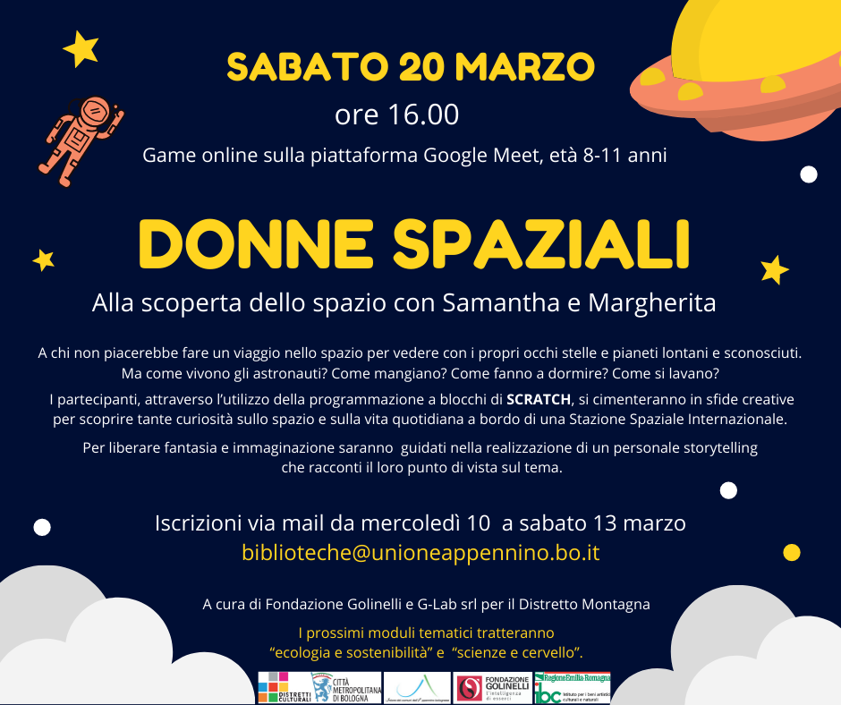 Sabato 20 marzo 2021 ore 16-18. Per bambini e bambine da 8 a 11 anni. Iscrizioni: da mercoledì 10 marzo fino a sabato 13 marzo 2021. Progetto Golinelli per le Biblioteche del Distretto Montagna.