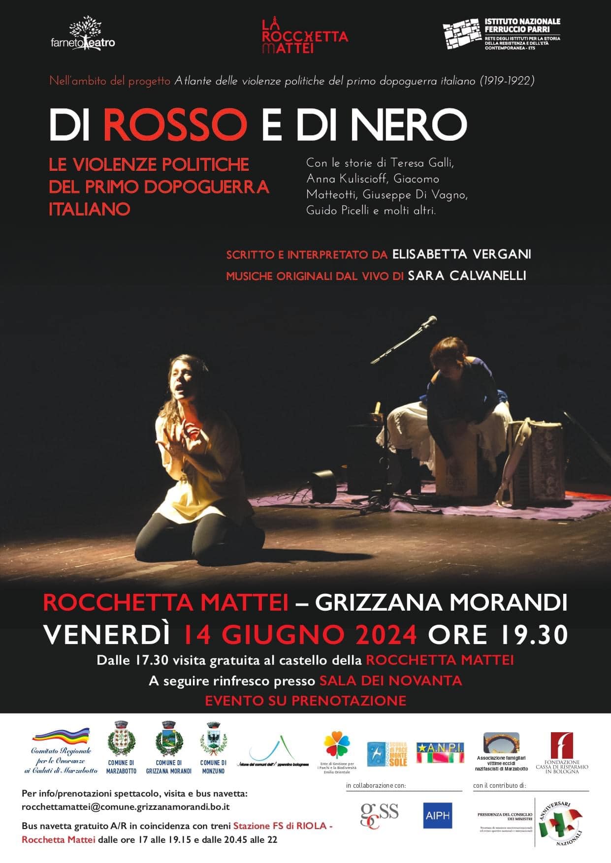Venerdì 14 giugno ore 19.30 alla Rocchetta Mattei. Elisabetta Vergani, accompagnata da Sara Calvanelli, racconterà le violenze politiche nel primo dopoguerra italiano (1919-1922), con le storie di Teresa Galli, Anna Kuliscioff, Giacomo Matteotti, Giuseppe Di Vagno, Guido Picelli e molti altri. A cura di Farneto Teatro, promosso da Istituto Nazionale Ferruccio Parri e Comitato Regionale per le Onoranze ai Caduti di Marzabotto.