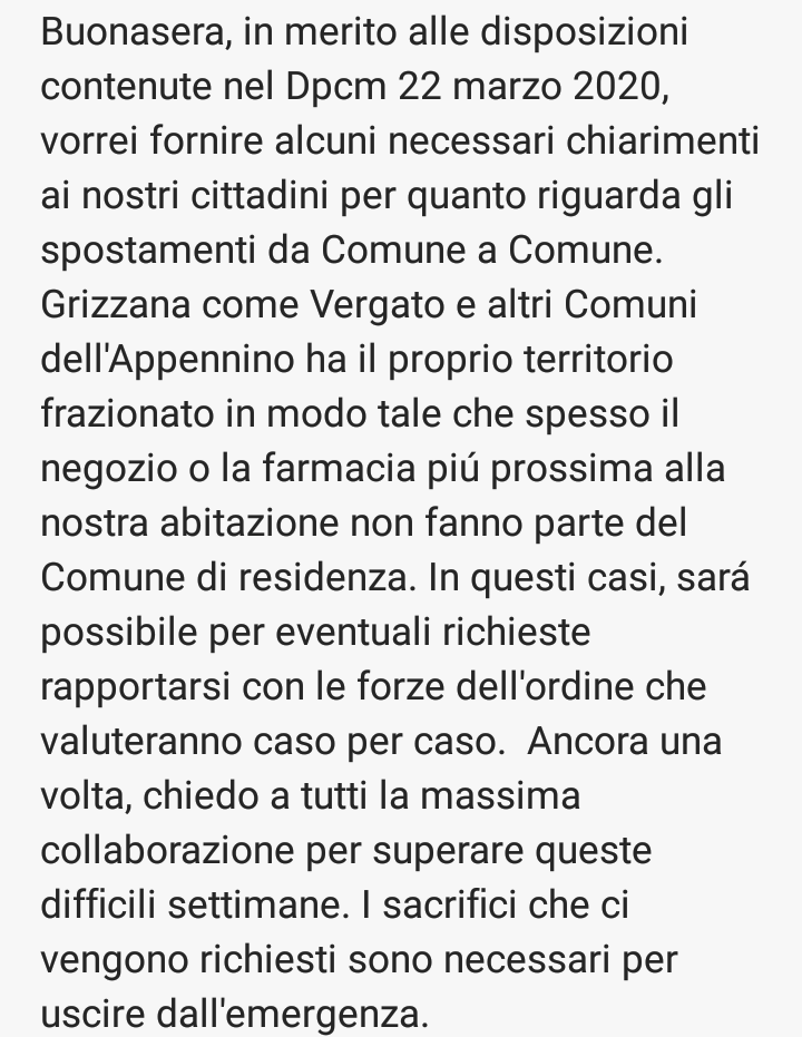Chiarimenti del Sindaco in merito alle disposizioni contenute del Dpcm 22/03/2020