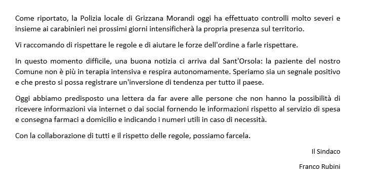 Comunicato del Sindaco