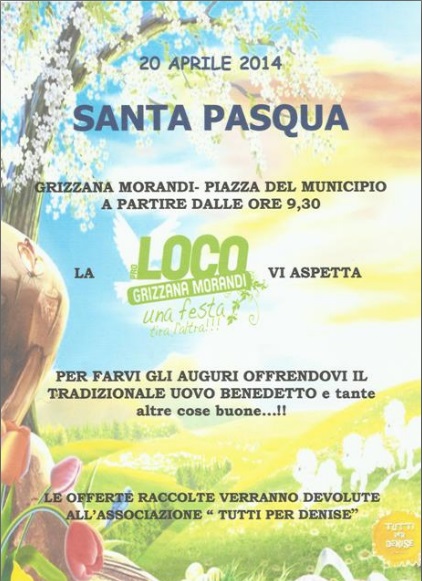 Pro Loco Grizzana Morandi farà gli auguri di Buona Pasqua ai cittadini offrendo l'uovo benedetto e tante altre cose buone. Le offerte saranno devolute in beneficienza.