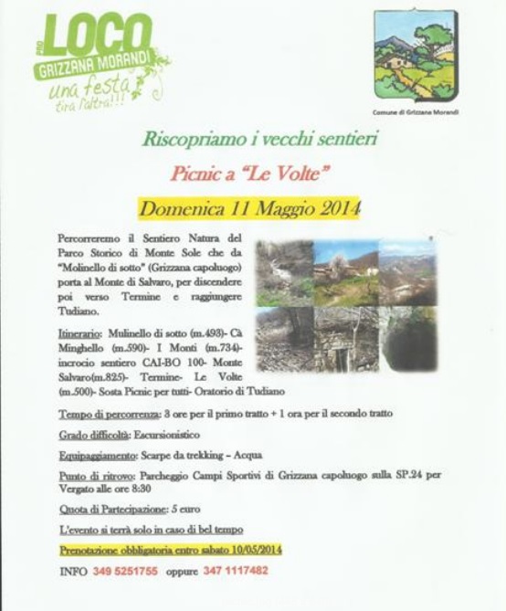 Picnic a "Le Volte". Domenica 11 maggio 2014. Partenza: ore 8.30 dal parcheggio dei Campi Sportivi di Grizzana Morandi. Prenotazione obbligatoria.