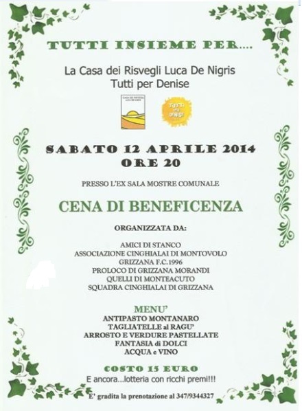Sabato 12 aprile ore 20 presso l'ex Sala Mostre cena di beneficenza a favore di La Casa dei risvegli Luca De Nigris e Tutti per Denise