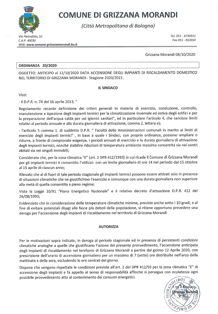 Accensione anticipata degli impianti di riscaldamento domestico al 12/10/2020