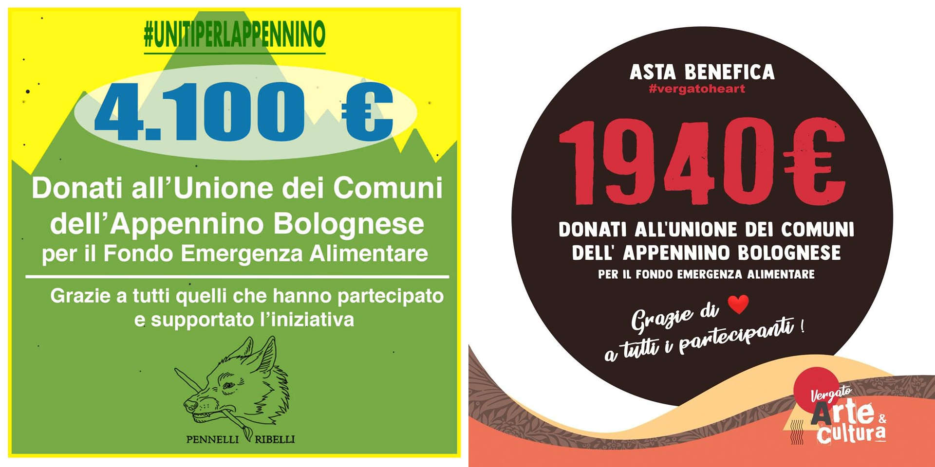 Due aste di beneficenza realizzate grazie alle associazioni Pennelli Ribelli e Vergato Arte e cultura hanno consentito di donare all’Unione una cifra che simbolicamente dimostra la vicinanza degli artisti alla popolazione, in questo momento di difficoltà