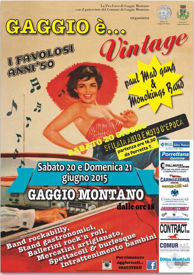 Due giorni di festa dedicati al Vintage a Gaggio Montano con i favolosi Anni ’50. A partire dalle ore 18, nelle due serate, musica rockabilly con la Paul Mad gang & Monokings band; stand gastronomici, ballerini rock’n roll, mercatini d’artigianato; spettacoli e burlesque e intrattenimento per i bambini. Sabato sfilata d’auto d’epoca (con partenza da Porretta Terme alle ore 16.30).