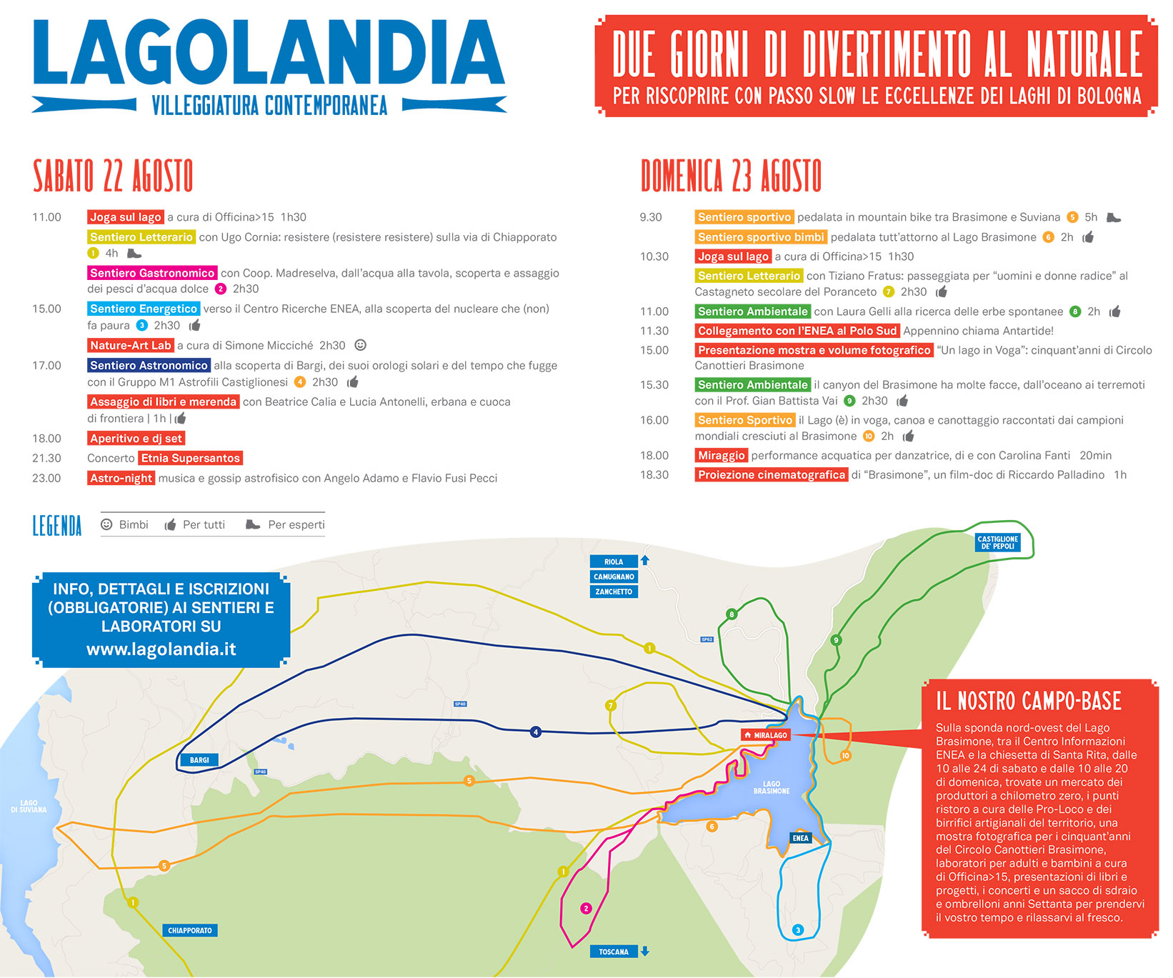 Il 22-23 agosto torna Lagolandia – Villeggiatura Contemporanea, riconfermando il format della prima edizione: eventi, spettacoli, laboratori e tanto relax sulle sponde del Bacino di Brasimone e 10 nuovi “sentieri culturali” alla scoperta dell’area dei Laghi di Bologna.