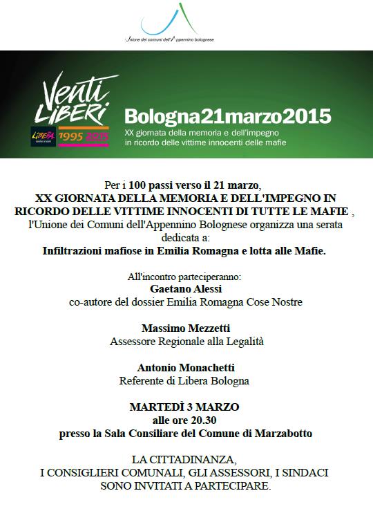 “Infiltrazioni mafiose in Emilia-Romagna e lotta alle Mafie”, questo il titolo della serata organizzata martedì 3 marzo (ore 20.30) dall’Unione Comuni Appennino Bolognese, presso il Municipio di Marzabotto.