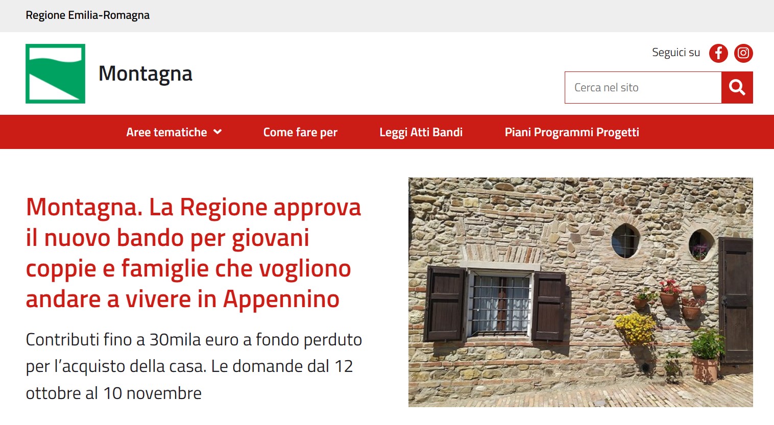 La Regione fa il bis e lancia il nuovo bando rivolto alle giovani coppie e famiglie che desiderano acquistare una casa in uno dei 121 comuni dell’Appennino emiliano-romagnolo. Cinque milioni di euro le risorse a disposizione per contributi a fondo perduto da un minimo di 10mila a un massimo di 30mila euro.