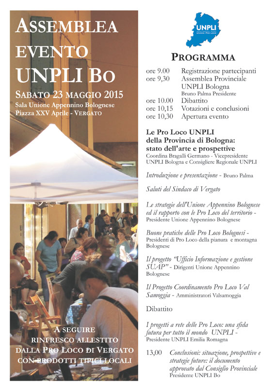 “Le Pro Loco UNPLI della Provincia di Bologna: stato dell’arte e prospettive” è il titolo dell’iniziativa in programma sabato 23 maggio nella Sala Unione Comuni Appennino Bolognese di Piazza XXV aprile, a Vergato. In apertura della mattinata (a partire dalle ore 9 con la registrazione dei partecipanti) si terrà l’Assemblea Provinciale di UNPLI Bologna con l’intervento del Presidente Bruno Palma cui faranno seguito il dibattito e le votazioni e conclusioni.