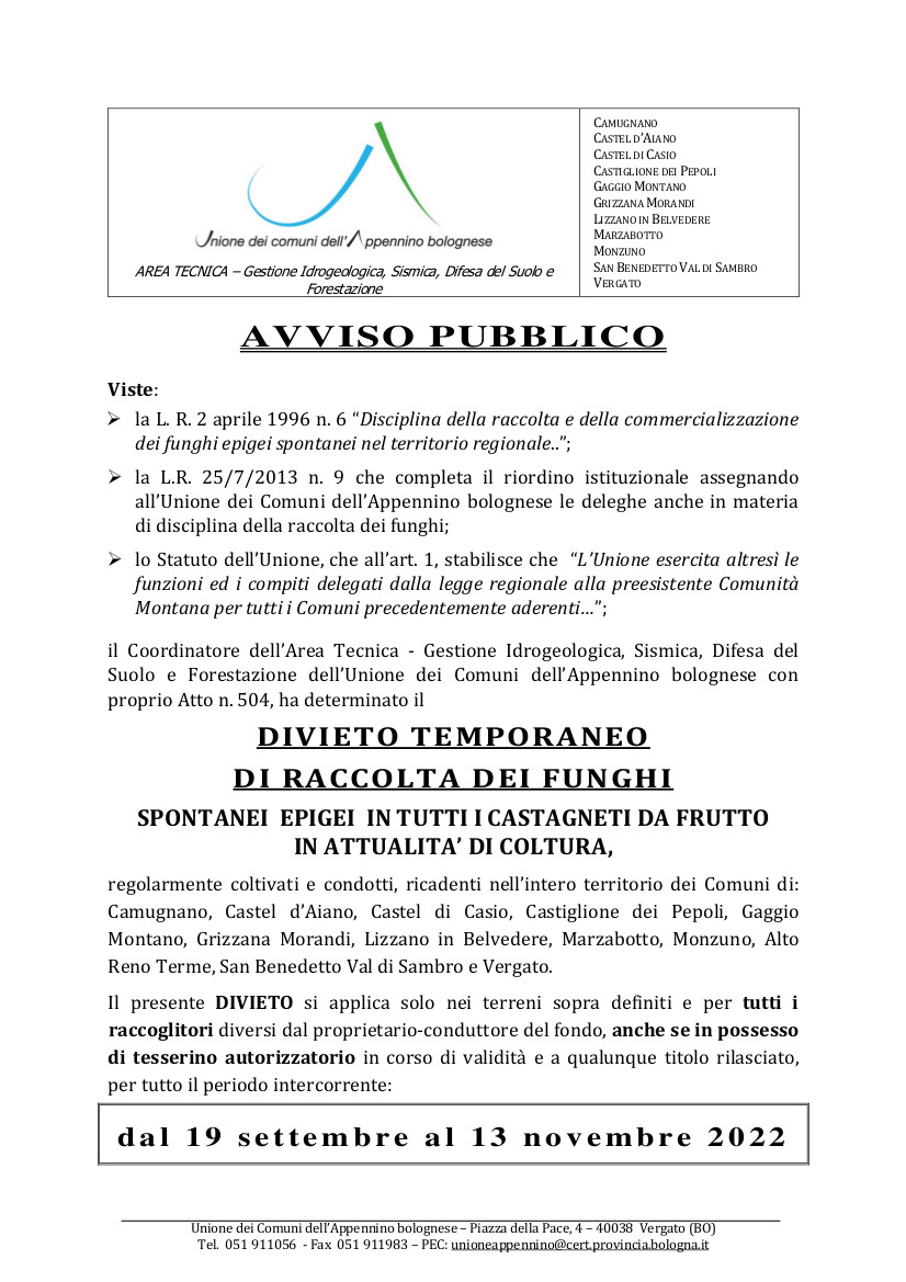Scatterà dal 19 settembre fino al 13 novembre il divieto temporaneo di raccolta dei funghi spontanei epigei in tutti i castagneti da frutto in attuali di coltura regolarmente coltivati e condotti, ricadenti nell’intero territorio dei Comuni di Camugnano, Castel d’Aiano, Castel di Casio, Castiglione dei Pepoli, Gaggio Montano, Grizzana Morandi, Lizzano in Belvedere, Marzabotto, Monzuno, Alto Reno Terme, San Benedetto Val di Sambro e Vergato. Il divieto si applica solo nei terreni sopra definiti e per tutti i raccoglitori diversi dal proprietario-conduttore del fondo, anche se in possesso di tesserino autorizzatorio in corso di validità e a qualunque titolo rilasciato, per tutto il periodo che va dal 19 settembre al 13 novembre 2022.A regolare il divieto la L. R. 2 aprile 1996 n. 6 “Disciplina della raccolta e della commercializzazione dei funghi epigei spontanei nel territorio regionale..”; la L.R. 25/7/2013 n. 9 che completa il riordino istituzionale assegnando all’Unione dei Comuni dell’Appennino bolognese le deleghe anche in materia di disciplina della raccolta dei funghi; lo Statuto dell’Unione, che all’art. 1, stabilisce che “L’Unione esercita altresì le funzioni ed i compiti delegati dalla legge regionale alla preesistente Comunità Montana per tutti i Comuni precedentemente aderenti…”; il Coordinatore dell’Area Tecnica - Gestione Idrogeologica, Sismica, Difesa del Suolo e Forestazione dell’Unione dei Comuni dell’Appennino